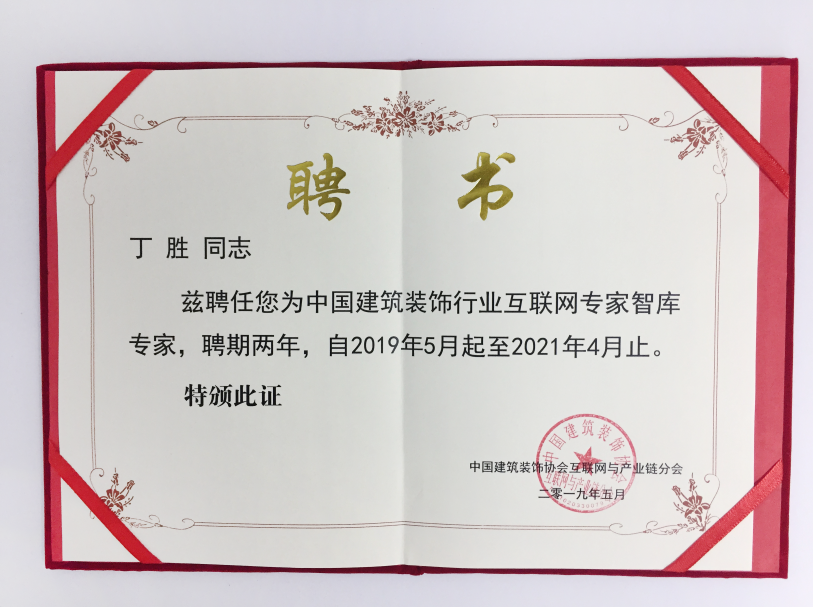 同時(shí),具有16年裝飾行業(yè)經(jīng)驗(yàn)的云立方CEO——丁勝受聘為中國(guó)建筑裝飾行業(yè)互聯(lián)網(wǎng)專家智庫(kù)專家。