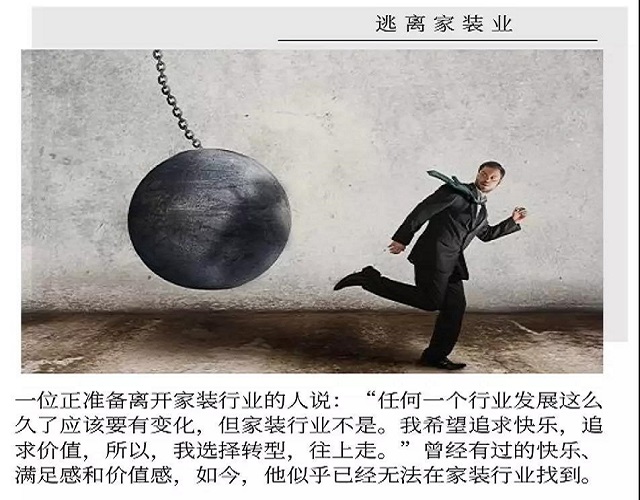 他答:“任何一個(gè)行業(yè)發(fā)展這么久了應(yīng)該要有變化,但家裝行業(yè)不是。我希望追求快樂,追求價(jià)值,所以,我選擇轉(zhuǎn)型,往上走。”曾經(jīng)有過的快樂、滿足感和價(jià)值感,如今,他似乎已經(jīng)無法在家裝行業(yè)找到。