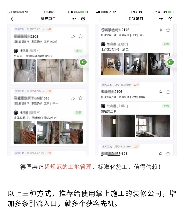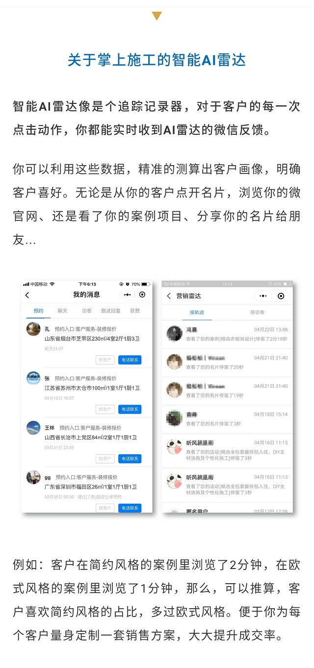 官網(wǎng)的最大用處,是讓客戶看到全方位的情況,裝修業(yè)務(wù)類型、案例精選、設(shè)計(jì)團(tuán)隊(duì)、裝修保障等,但在公司的角度,還是希望官網(wǎng)不止是一個“被看”的網(wǎng)頁,更多還是實(shí)實(shí)在在的獲客。所以,把掌上施工的工地、聯(lián)系人名片、海報(bào)二維碼等,通過無縫銜接到官網(wǎng)里,客戶一掃碼,贏得跟客戶聯(lián)系的主動權(quán),業(yè)務(wù)就這么來了~