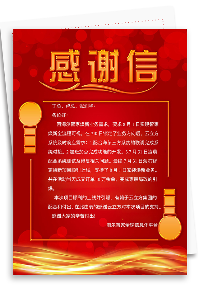云立方收到海爾智家的感謝信后,更加堅定走信息化賦能道路,解決裝企裝修痛點、打通員工、供應(yīng)商與業(yè)主之間的信息孤島,從而簡化裝修流程、縮短產(chǎn)業(yè)鏈條、降低運營成本、提升整個裝修效率及品質(zhì)。