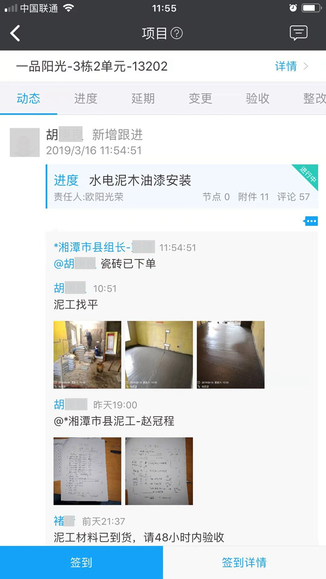 一個工地從開始到結束是需要一段時間的,所以這個過程要不斷向業主匯報工地進度。大多數裝企會利用微信群,以業主為中心將每個參與人員都拉進群,通過每次施工進度在群里匯報。