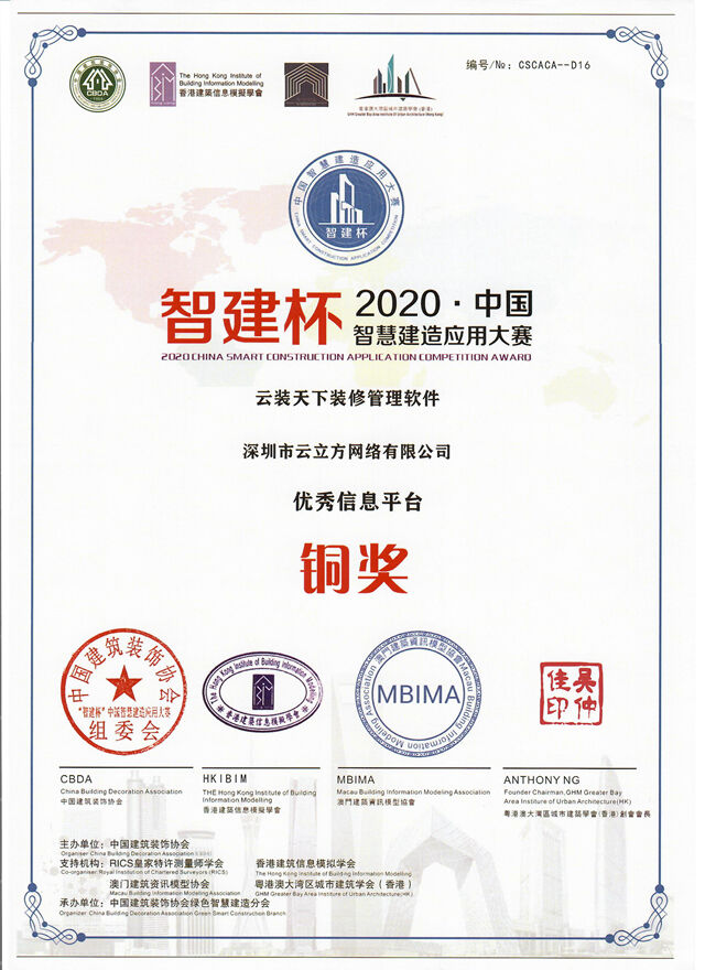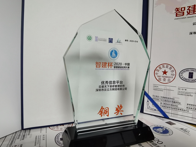 云立方在2020“智建杯”中國智慧建造論壇中脫穎而出,榮獲優(yōu)秀信息平臺銅獎。此次大賽由中國建筑裝飾協(xié)會主辦、中國建筑裝飾協(xié)會綠色智慧建造分會和深圳市裝飾行業(yè)協(xié)會協(xié)辦。