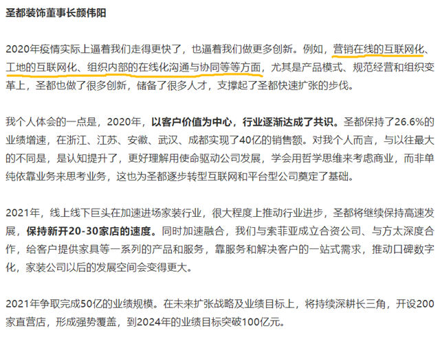 圣都家裝已公開(kāi)宣布,2020年銷售額實(shí)現(xiàn)40億,業(yè)之峰沒(méi)有公開(kāi)宣布,但在論壇上也口頭表述,2020年實(shí)現(xiàn)大概40億左右的目標(biāo)。這兩家宣布10年做到300億的家裝公司,也都實(shí)現(xiàn)第一年的目標(biāo)。