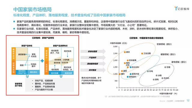 在家裝行業內部,標準化程度、產品體積、落地服務程度和技術壁壘也決定了家裝行業內部的格局。